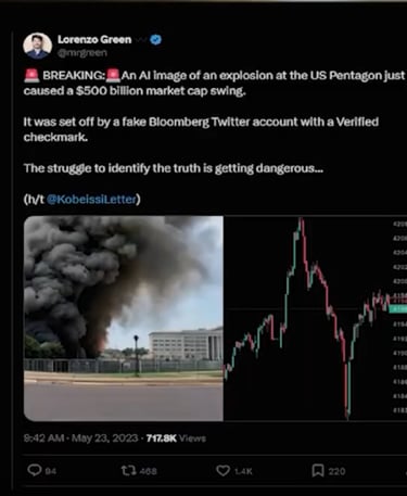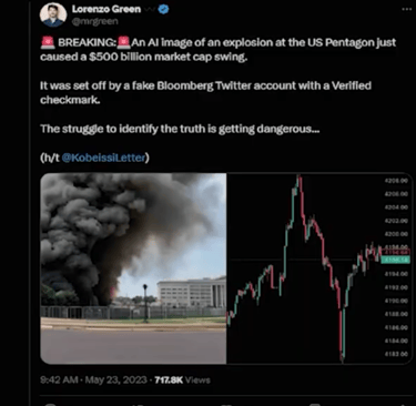 On May 23rd, 2023 an image of a Pentagon Explosion went viral. Within Minutes the image managed to move stock prices dramatically, with it also some crypto values, like Ethereum.